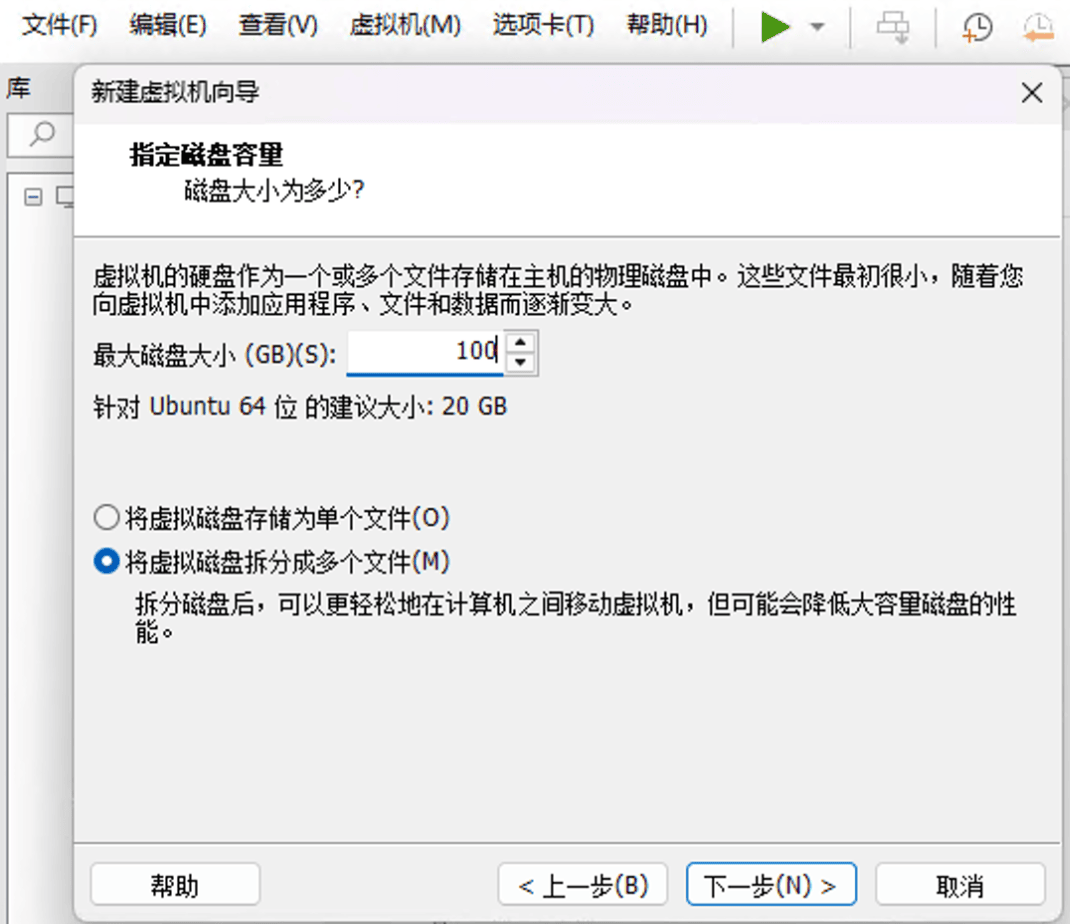 - 设置虚拟机磁盘大小,建议设置最少100G