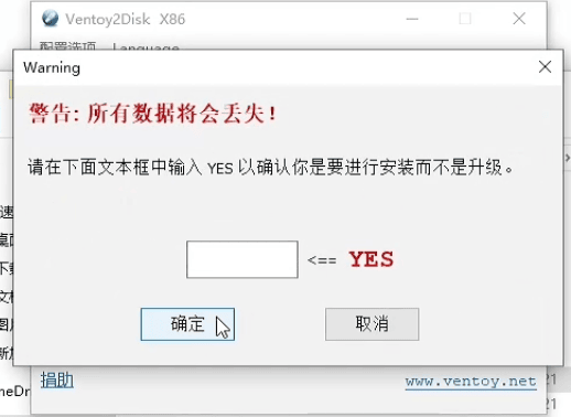 3.点击安装,此操作会清除所有U盘数据,请提前备份U盘内所有数据,输入YES然后点击确认直至等待显示成功完成